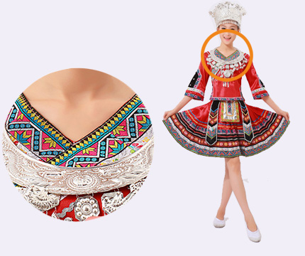 V型领口设计,镶以苗族特色花边,刚好露出优美的锁骨和脖颈线。