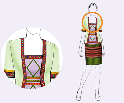 领型采用无领镶边设计,配以海南黎族花纹装饰,赋予民族文化内涵.
