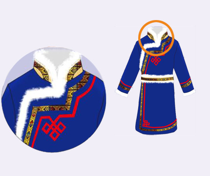 领型采用立领加绒设计,配以蒙古族特色花纹装饰,赋予民族文化内涵.