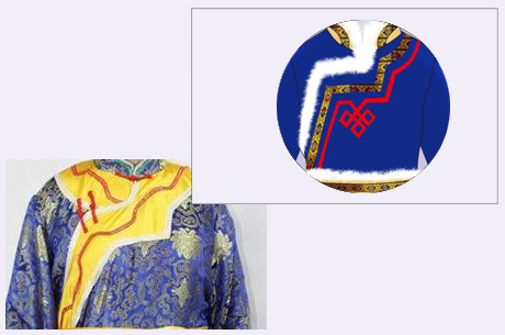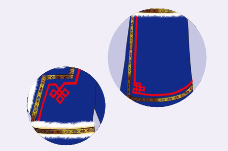 3. 纹饰 借鉴蒙古族传统服饰,运用蒙古族特色花纹织带,蒙古族文化内涵融入服饰,美观大方.