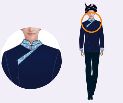 根据南宁九曲湾温泉服装要求特色,此套户外男服务员服装采用壮族喜爱的深蓝色作为主色系。壮族布包帽和特色民族花纹的点缀元素给服装带来不一样的感觉。结合温泉工作场合,采用淡蓝色的民族花纹做点缀,领口搓落拼接让服装富有层次感,斜门襟干净利落。搭配的深色长裤,让服装整体感强,让人感受到南宁九曲湾温泉给人带来特有的民族风情与服务。